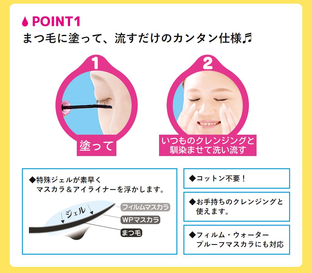 コットン不要なので、目元を擦らずに簡単にマスカラをオフできます。目にしみにくい処方の上、3つの美容液成分を入れる事で負担がかかりにくくなっています。