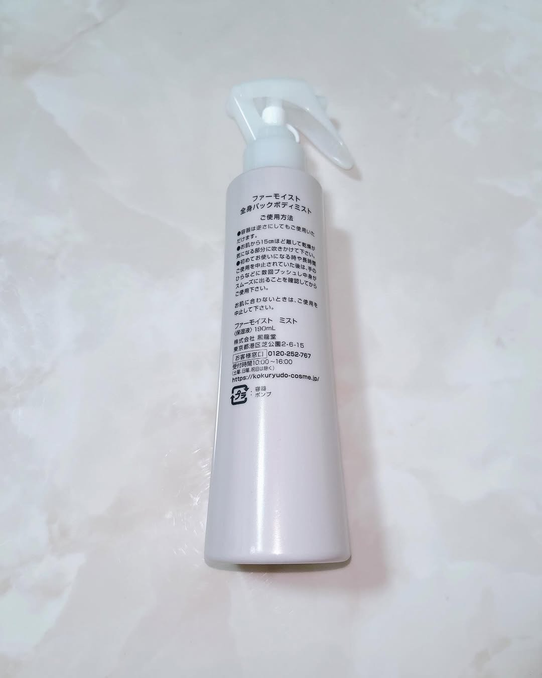 。:+* ゚ ゜゚ *+:。:+* ゚ ゜゚ *+:。:+* ゚ ゜゚ *+:。 ファーモイスト 全身パックボディミストをいただきました‼️😍 商品 株式会社黒龍堂 ファーモイスト 全身パックボディミスト ワセリンのボディミストを使用しました🎵 微粒子ワセリン※1が潤いをパックする高保湿ボディミスト。 まるでボディの美容液、18種の美肌成分※1を贅沢配合。 ワセリンのジェルは使った事あったんですけど、ミストタイプがあったの知らなかったです😳 お風呂上がりのボディケア、結構面倒なんです。 でも、ミストタイプならお風呂場でシュっと。 その後手でさっと馴染ませるだけ。 既に広範囲に広がってくれてるので、ホントさっとで完了✨ ベタ付かずしっとり。 逆さまでも使えるので、全身のケアが手軽に出来ます💕 ※1保湿成分 素敵な商品の出会いに感謝します🌷 ありがとうございました🥰 @kokuryudo_cosme #PR #株式会社黒龍堂 #ワセリン #時短ボディケア #高保湿ボディミスト #ファーモイスト全身パックボディミスト #monipla #kokuryudo_fan #美容好きな人と繋がりたい #コスメ好きさんと繋がりたい #ヘアケア好きさんと繋がりたい