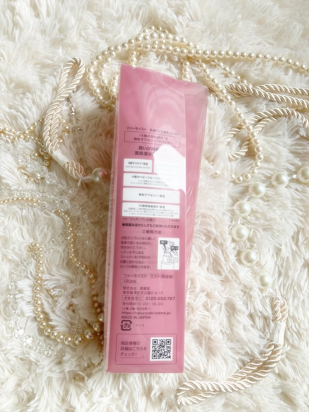 🕊𓂃 𓈒𓏸◌ ✼••┈┈••✼••┈┈••✼••┈┈••✼••┈┈••✼ ファーモイスト 全身パックボディミストを をお試しさせて頂きました🤗💞 微粒子ワセリンと18種の美肌成分を配合、華やかなフローラルガーデンの香りが特徴な、片手で手軽に全身保湿できる高保湿ボディミストです。 💛特徴💛 🔸微粒子ワセリン※1、セラミドNG・AP・NP、プラセンタエキス、加水分解サケ卵巣膜エキス、水溶性コラーゲンなど18種の美肌成分配合 🔸肌を潤し、バリア機能をサポート。 🔸フローラルガーデンの爽やかな香り(ジャスミン、イリス、レモン、ペアー) 🌿使い方🌿 ➡️肌から約15cm離して乾燥部分にスプレー。 (トリガーミストタイプで逆さでも使用可能) ※傷や湿疹のある部位には使用しない さっそくお風呂上りに使ってみました💚 逆さ使用可能な設計だから背中や足など手の届きにくい場所もケアできる手軽性がGOOD💖 ミストが細かく軽やくて、背中や足の後ろ後ろ部分にも簡単にシュッとスプレー保湿できて とても使いやすいよ🥰 華やかなフローラル系の香りに包まれながら、睡眠に行けるのが幸せタイム🛏️💤 忙しい日常でも片手で全身を保湿できる便利なボディーアイテムはいかがですか? 気になった人はチェックをお願いします🥰 素敵な商品をありがとうございました🤗💕 ✼••┈┈••✼••┈┈••✼••┈┈••✼••┈┈••✼ ファーモイスト 全身パックボディミスト 内容量:190mL 価格 :1,980円(税込) ✼••┈┈••✼••┈┈••✼••┈┈••✼••┈┈••✼ #PR #株式会社黒龍堂 #ワセリン #時短ボディケア #高保湿ボディミスト #ファーモイスト全身パックボディミスト #monipla #kokuryudo_fan