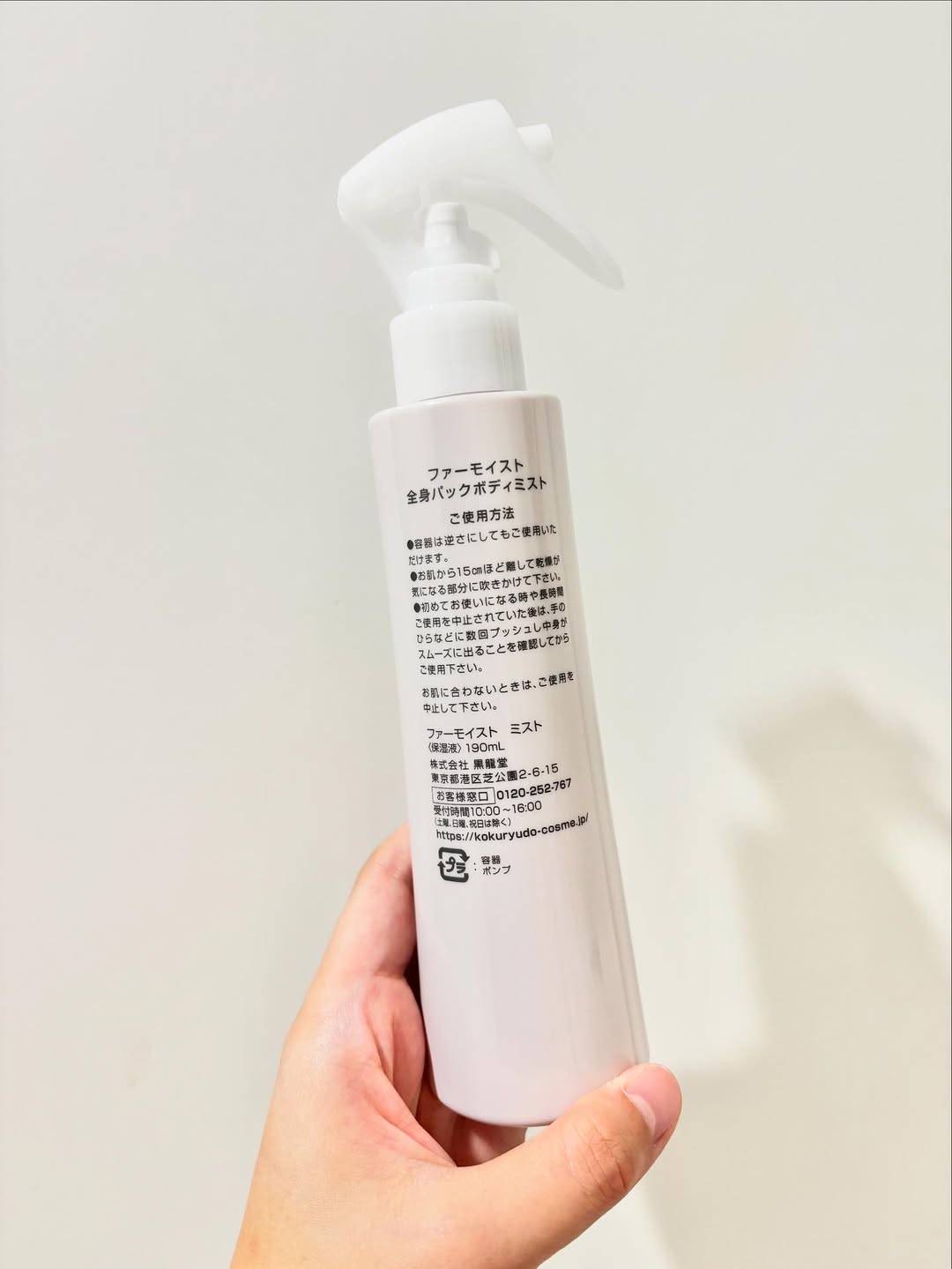 ▷ファーモイスト 【商品について】 微粒子ワセリン*¹配合で高保湿を実現! シュッと吹きかけるだけで18種の美肌成分*¹が スーッと角質層のすみずみまで浸透。 独自開発* ²の微粒子ワセリン*¹が肌表面に薄い膜を張ることで、補った潤いを長時間逃しません。 *¹保湿成分 * ²黒龍堂シリーズ内で 【使用感】 ワセリンがミストという新感覚な保湿ケアアイテム! ベタつき感なく使用できました。 ボトルを逆さにしてもスプレーできるから いつもはなかなか手の届かない背中まで シュッとするだけでケアできるのがいい👏🏻 フローラルガーデンの香りだそうですが、特に香りもきつくなく使用できました! #PR #株式会社黒龍堂 #ワセリン #時短ボディケア #高保湿ボディミスト #ファーモイスト全身パックボディミスト #monipla #kokuryudo_fan