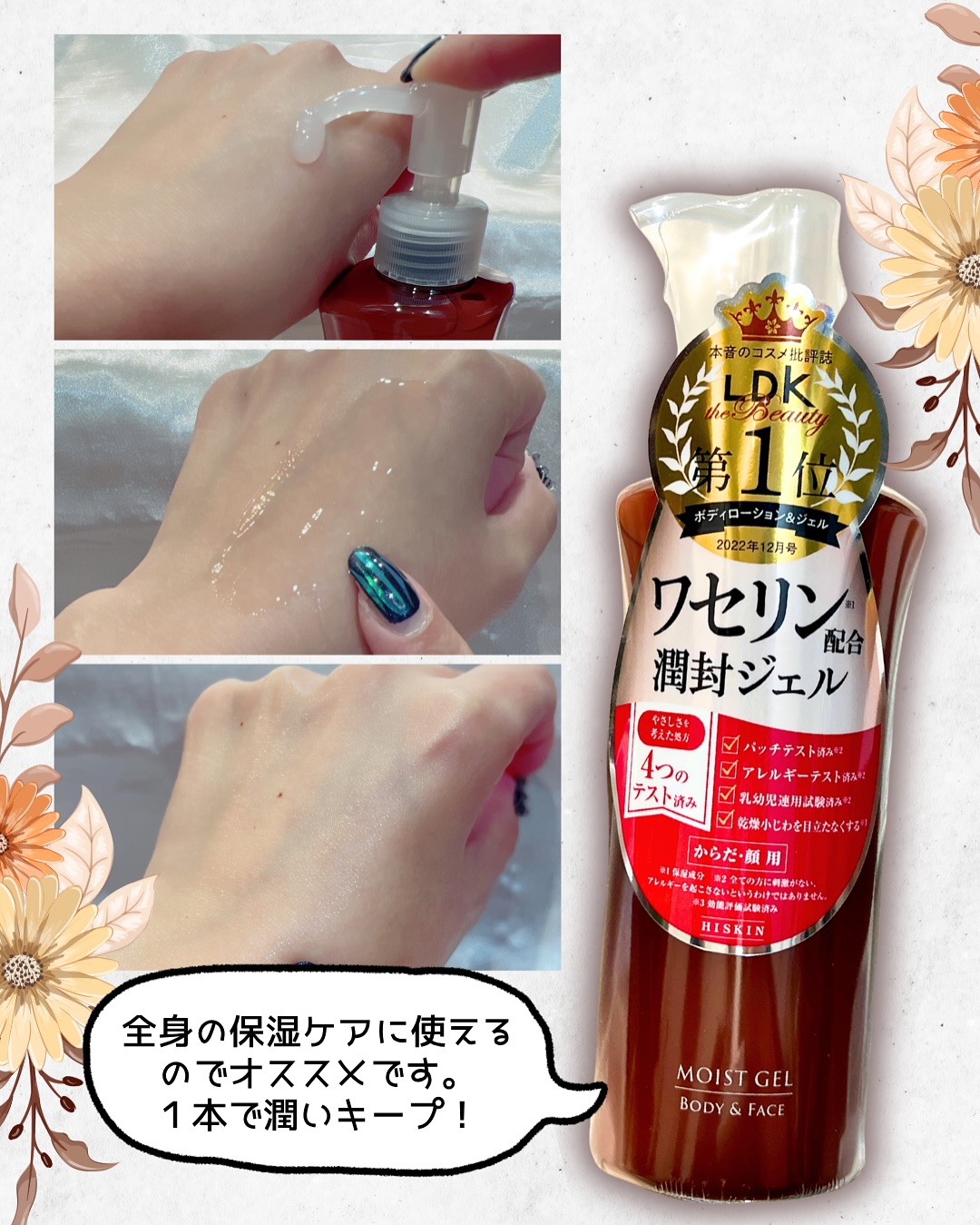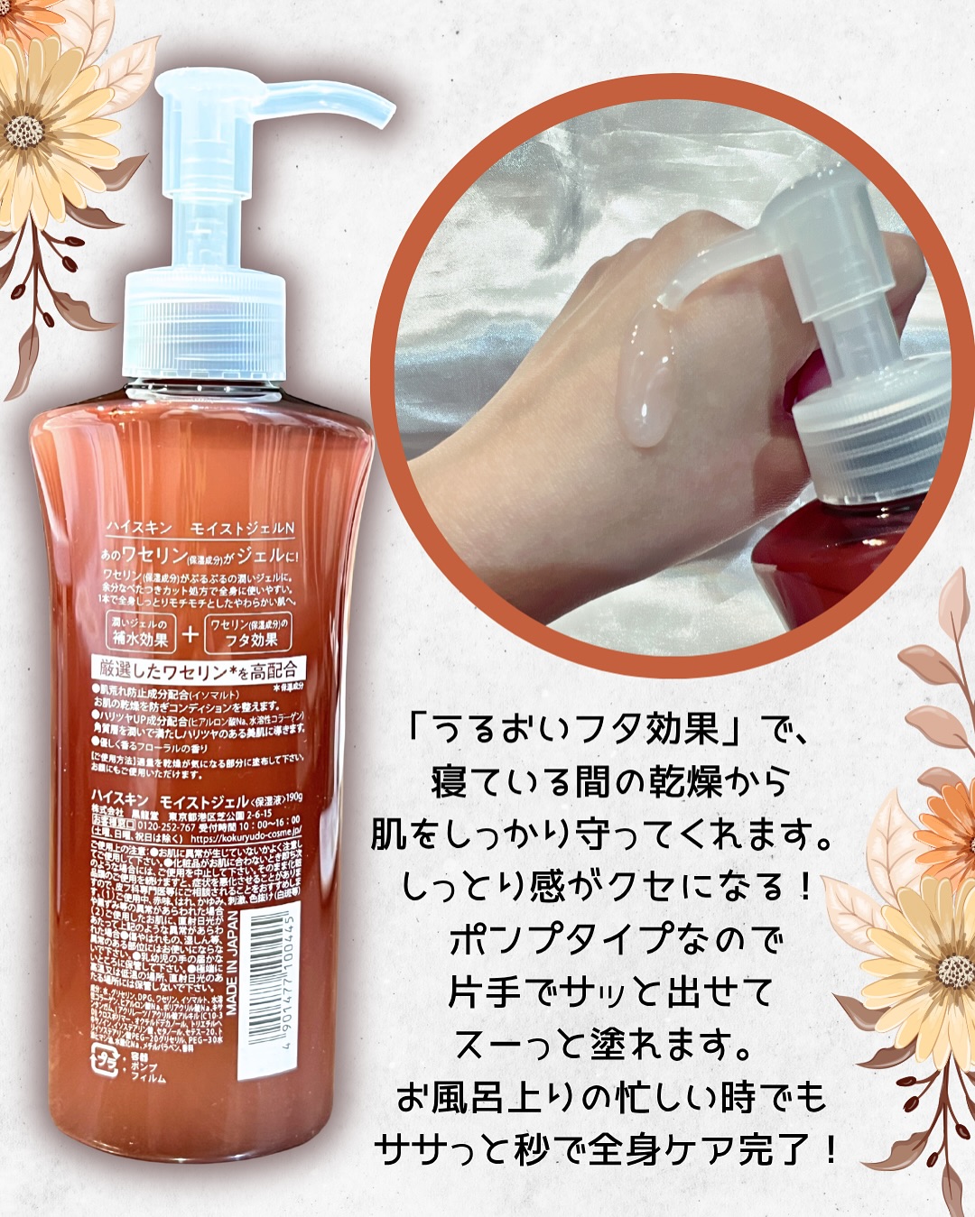 \🐻❄️ぷるっとべたつかない!🧡/ ハイスキン ぷるっとワセリン ※(保湿成分) 【ハイスキンモイストジェル】のご紹介です💁🏻♀️💕 最近のわたしの溺愛保湿アイテム🙌 【ワセリン】 と聞くと「ベタつきそう…」という イメージだったけど、これは全然違う❣️ 厳選したワセリン(保湿成分)を高配合してるのに、 余分なベタつきをカットした独自処方✨ ぷるんとした潤いを肌に閉じ込めてくれます🥺 ワセリンの「うるおいフタ効果」で、寝ている間の乾燥から 肌をしっかり守ってくれます。しっとり感がクセになる🤭 そして🧴 ポンプタイプでとっても使いやすいです✨ 片手でサッと出せるので、 お風呂上りの忙しい時でもササっと秒で全身ケア完了🙌 ヒアルロン酸Naや水溶性コラーゲン (ともに保湿成分)も配合🫶 優しく香るフローラルの香りで、 毎日の保湿タイムが楽しみに💐 香りはふんわり優しい感じなので気になりません。 これからの乾燥対策に本当におすすめ! 是非チェックしてみてね🤩🌼 ━━━━━━━━━━━━━━━━━━━━━ 🧡素敵な商品との出会いに感謝です🐻❄️✨ #PR #株式会社黒龍堂 #ワセリン #ワセリンジェル #保湿ジェル #Charmレポ #ハイスキンモイストジェルN #monipla #kokuryudo_fan 最後まで読んでくれてありがとう🙌 🌼フォローしてくれると嬉しいよ🐻❄️ ↳ @charmix2020 ━━━━━━━━━━━━━━━━━━━━━