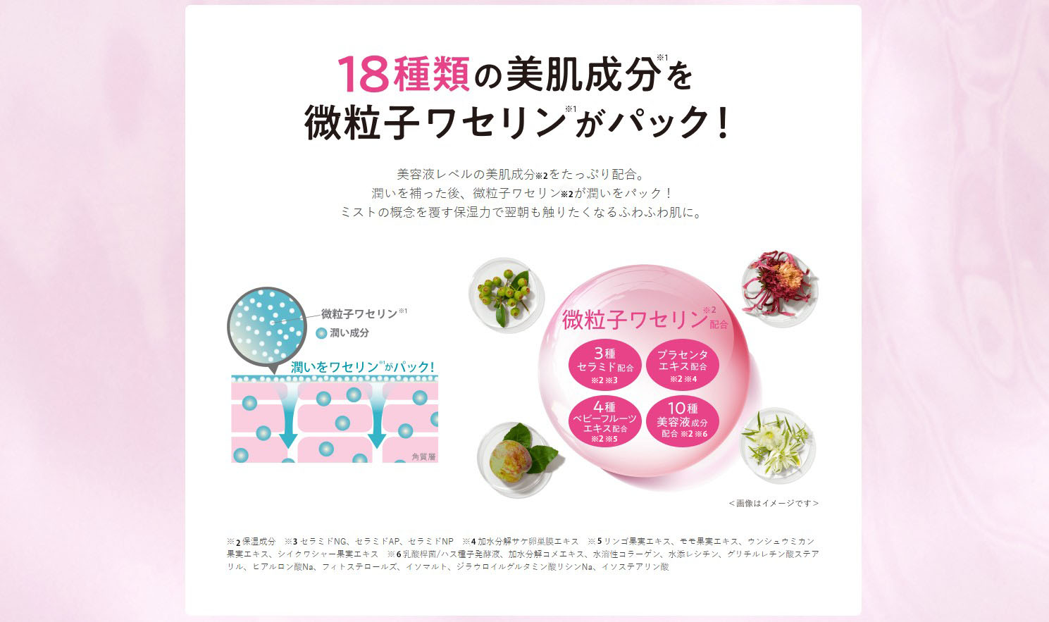 18種の美肌成分※1を微粒子ワセリン※1がパック!※1保湿成分