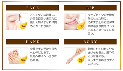 ※アルガン油発酵液(プセウドジマエピコラ/アルガニアスピノサ核油発酵液)、オリーブ油発酵液(プセウドジマエピコラ/オリーブ果実油発酵液)、緑茶種子油発酵液(プセウドジマエピコラ/(チャ種子油/グルコース/酵母エキス)<保湿成分>