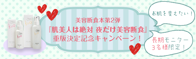 美容断食本第2弾「肌美人は絶対 夜だけ美容断食」の出版、即日の重版決定を記念し、約一ヶ月間、フルボトルサイズで美容断食を実践していただく方を募集です!