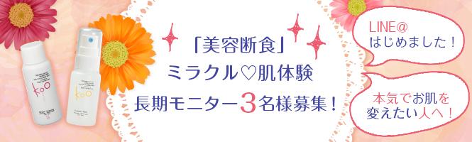 Koo美容断食はお肌のお悩みを解決して頂くためのアイテムとして、ぜひ取り入れて頂きたいと思い、開発いたしました今回は、フルボトルサイズで美容断食を実践していただく方を3名募集します!