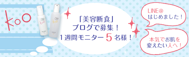 Koo美容断食はお肌のお悩みを解決して頂くためのアイテムとして、ぜひ取り入れて頂きたいと思い、開発いたしました。今回は、ミニボトルサイズで美容断食を実践していただく方を5名募集します!