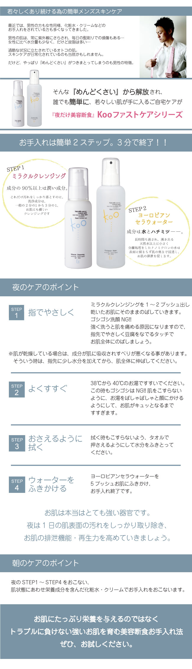 更に自社開発、専売のスキンケア製品 Koo シリーズをインターネットで販売を行っております。Koo ファストシリーズでは、新発想の素肌美を助ける『美容断食』を提唱しています。これは一定期間お肌に何も乗せない、いわば『お肌の断食』の状態を毎晩作ることにより、お肌を本来の排泄器官(人間の臓器のひとつ)としてしっかりと働かせることで、肌を健康な状態に着目することをコンセプトとし、各メディアでもとりあげられ評価を頂いております。