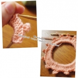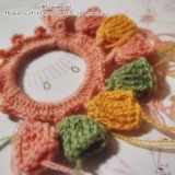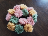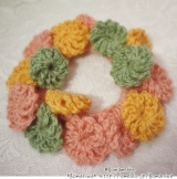 まるで、お花で作った小さなリースのよう。幾重にも花びらが重なったバラや、小さな花を寄せ集めたバーベナなど、それぞれのお花が持つ個性をかぎ針編みでリアルに表現。