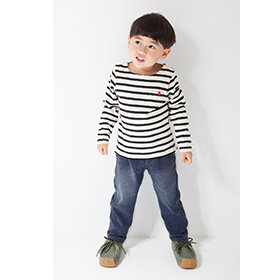 HELLO♪*゚٩(*Ü*)今日はとっても天気が良くて桜もだいぶ開花してきています。でもまだ風が冷たくて自転車では寒いくらいです。早く風が生温くならないかなぁ~。今日は娘っ子のコーデから最近写真撮るときベーする娘アインシュタインかぁ(^^;;↓↓↓ベスト/母手作り品ボーダーT/無印良品デニム/nobittsuバックstyle身長88cm弱で90cm着用太もも太めな娘っ子でもゆとりのあるパンツ。長さもたっぷり。脚長テーパードタイプ♥UNIQLOさんのより丈、長めです。じゃーん!!!ウエストゴム