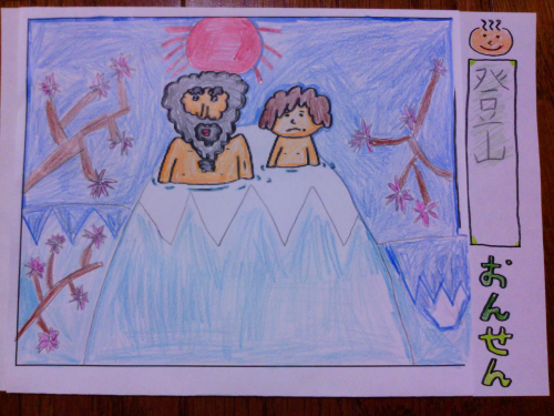 小学3年生の娘が書きました 自分がピアノを弾いていたら、楽器、スピーカー、動物達が集まってきて みんなできれいな音を出しあって、音の温泉につかっている所だそうです 送って戴いたワークシートで書くことが出来ました ぺたこ様ありがとうございます 2014/01/28