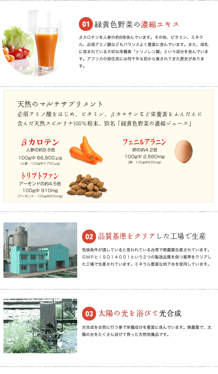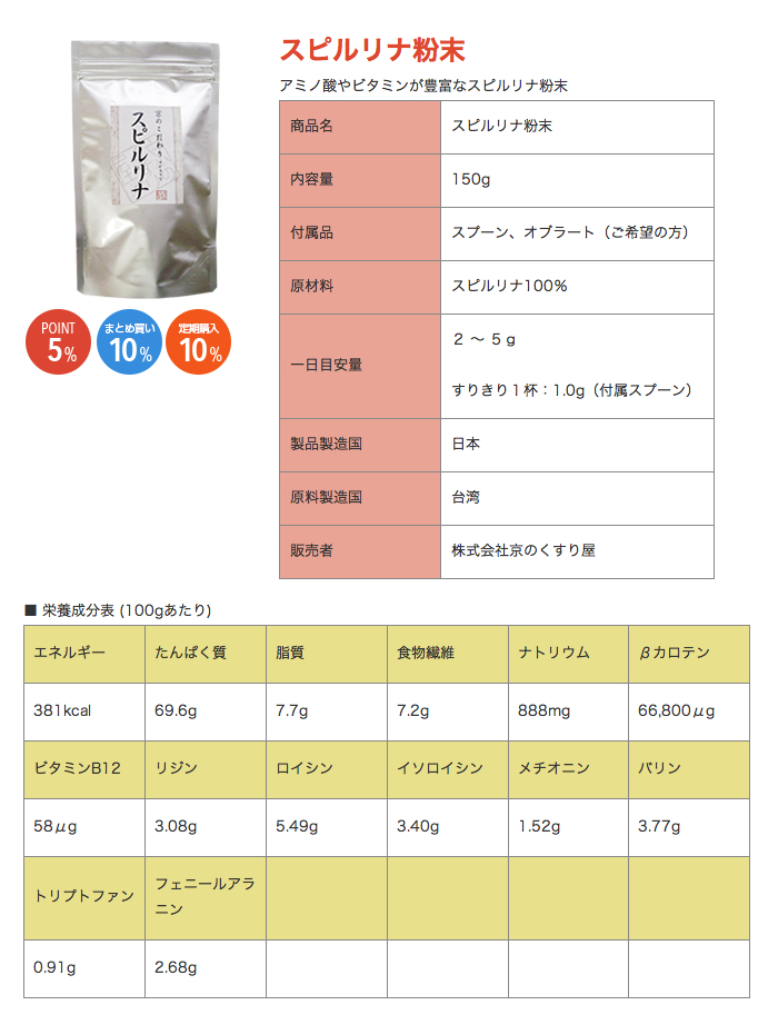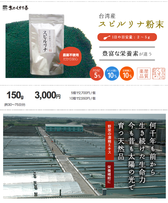 ☆天然培養品/スピルリナ原料使用☆ 農薬不使用“スピルリナ”100%粉末 天然のマルチサプリメントと呼ばれています。 *お得で便利な定期購入(10%OFF&定期3回以上継続で景品プレゼント)や、 おまとめ買い割引(10%~15%OFF)もございます。 <商品ページはこちら> http://yasashisa.net/web/archives/items/718