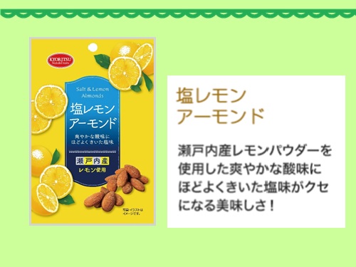 ローストしたアーモンドを、酸っぱい爽やかさの塩レモン味に仕上げました。濃い目の味付けがクセになる一品です。