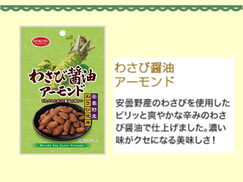 ローストしたアーモンドを、ピリッと爽やかな辛みのわさび醤油味で仕上げました。濃い目の味付けがクセになる一品です。