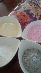 オレンジ、パープル、ブラック、ホワイトの食用色素入り粉糖。