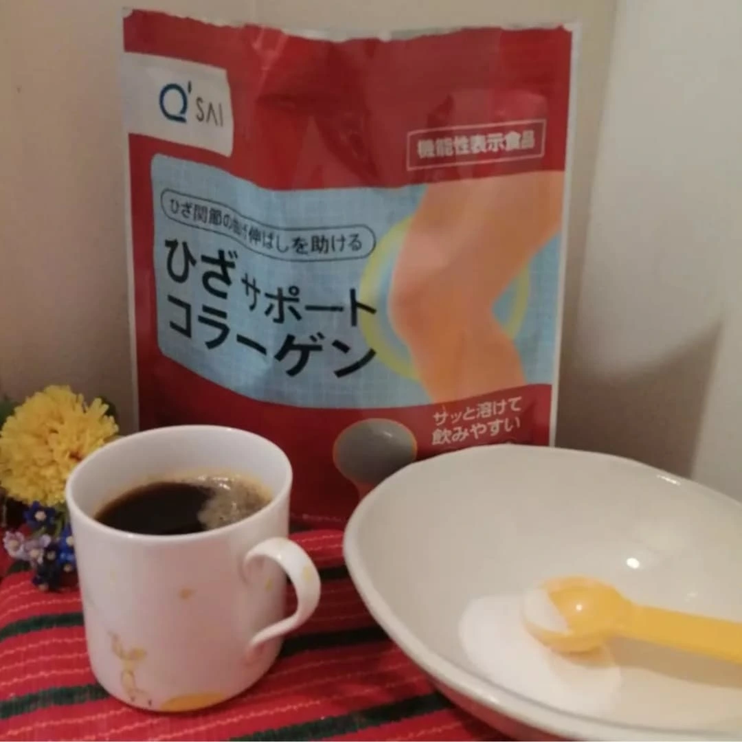 キューサイのひざサポートコラーゲンです❣️60代の母が膝に違和感があると言うので、コラーゲンを飲み始めました! パウダーがさらさらで溶けやすく、飲み物や食べ物に混ぜてもにおいをほとんど感じないので気に入っているようです🥰 付属のスプーンにすり切り2杯(目安)を毎日コーヒーに混ぜて飲んでいます🎵 実家と家が近いので、実家と私の家に一袋ずつ置いて飲み忘れないようにしています😉 今までコラーゲンの味が苦手で何度か挫折していた母ですが、これなら味にクセがないので続けられると喜んでいます♡