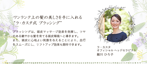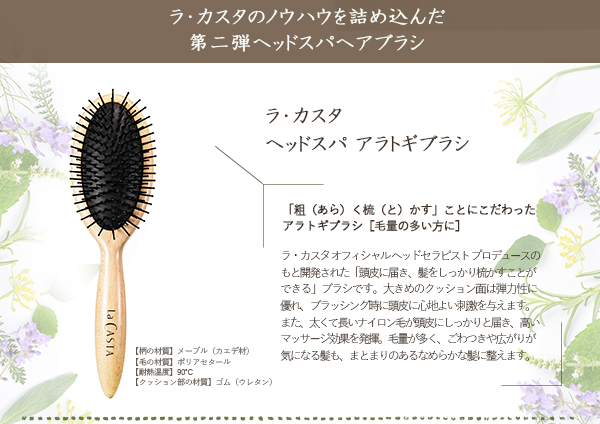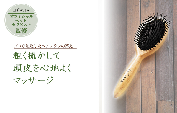 「粗(あら)く梳(と)かす」ことにこだわったアラトギブラシ[毛量の多い方に] ラ・カスタ オフィシャル ヘッドセラピスト プロデュースのもと開発された「頭皮に届き、髪をしっかり梳かすことができる」ブラシです。大きめのクッション面は弾力性に優れ、ブラッシング時に頭皮に心地よい刺激を与えます。また、太くて長いナイロン毛が頭皮にしっかりと届き、高いマッサージ効果を発揮。毛量が多く、ごわつきや広がりが気になる髪も、まとまりのあるなめらかな髪に整えます。 【柄の材質】メープル(カエデ材) 【毛の材質】ポリアセタール 【耐熱温度】90℃ 【クッション部の材質】ゴム(ウレタン)