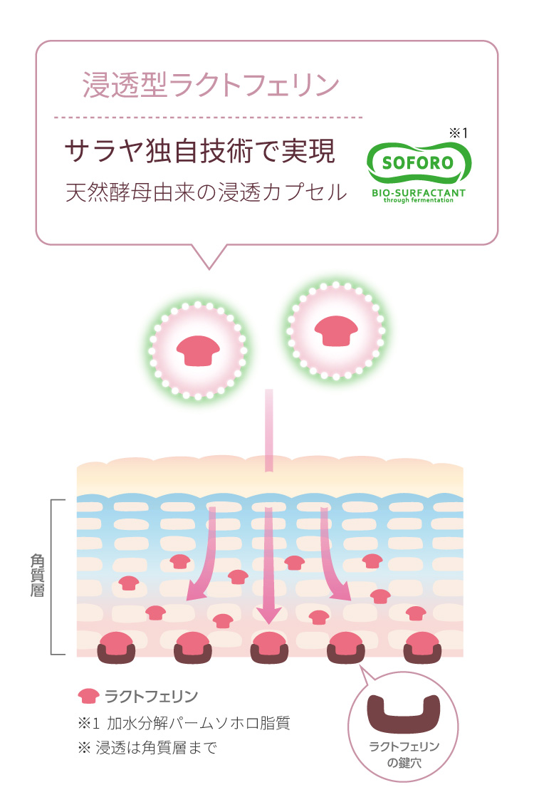 SARAYAラクトフェリン研究所がたどり着き開発した「浸透型ラクトフェリン」が、あなたの肌に眠る“鍵穴”にラクトフェリンを届け、うるおいに満ちた内側から輝く肌へと導きます。