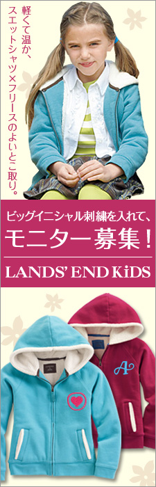 11/8(日)までにご応募いただいた方、抽選で4名様に、ランズエンドキッズの「フリース・フロントジップ・フーディ」をモニターしていただきます。モニター商品のサイズ展開は125~150cmです。ご希望のイニシャル刺繍をお入れします。