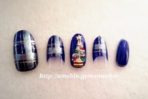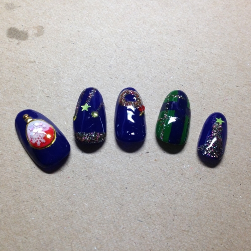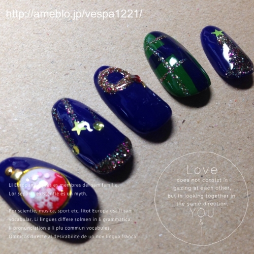 当選したイルミネーションネイルを再現しました! パフュームボトルの中のお色をブルーではなくフェアリーレッドで再現 ラメは単色ではなくイルミネーションのようなMIXラメをふんだんに使用しました 3Dになるように盛っています 薬指はいただいたカラージェルでチェック柄を入れてみました 2014/12/24