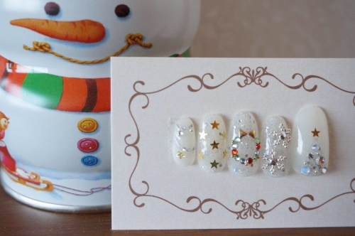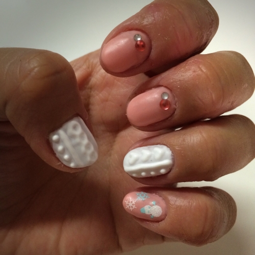 ラソプロマットジェルを使用して、ガーリーなニットネイルにしました白×ピンクの組み合わせは男性受けも抜群なので、クリスマスデートにも小指に雪の結晶と雪だるまのシールを貼り、冬らしく仕上げました 2014/12/07