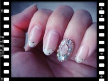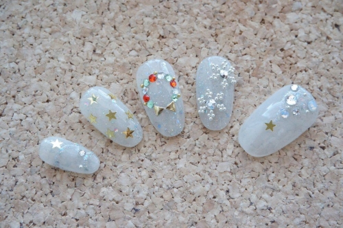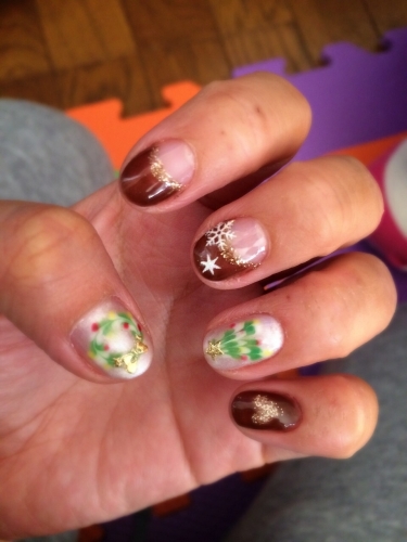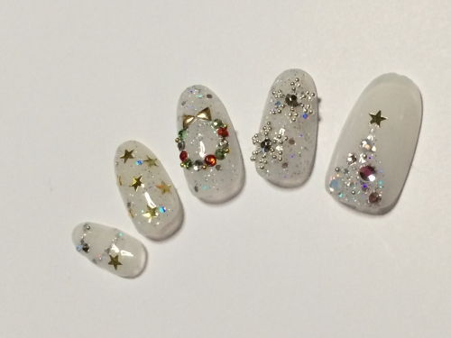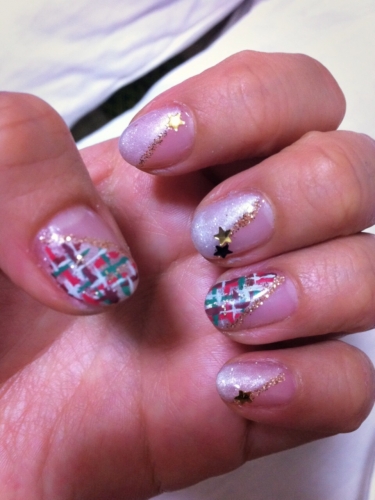 当選したイルミネーションネイルを再現しました! パフュームボトルの中のお色をブルーではなくフェアリーレッドで再現 ラメは単色ではなくイルミネーションのようなMIXラメをふんだんに使用しました 3Dになるように盛っています 薬指はいただいたカラージェルでチェック柄を入れてみました 2014/12/24