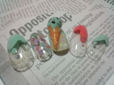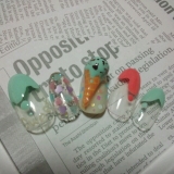 ジェルネイルLaso pro.ファンサイト参加中パーツネイルまとめなんつってモニター記事終わりとみせかけてまた作ってみたよ(^-^)パーツネイル楽しい(*´罒`*)♡さくらもちネイルやってみて、これ、アイスもいけんじゃない?と思って作ってみたのさくらもちってーと春モノだけど、アイスなら夏もいけるよ!出来上がりはこちらっアイスどどーん!大好きなチョコミントアイスー♡メインのアイスクリームは…まずはジェルシートをまるめてコーン部分を。ミルキーカラーのオレンジで作ったよ。そこに、パステルにゃんこネイルでも作ったジェルボール。PS-11で色付けして、ブラウンのジェルでチョコをちょちょっと塗って、コーン部分とドッキングー強度のために、ドッキング前にコーンの中をクリアで埋めて、そのあとクリアでくっつけたよ。アイスの指のベースはPS-01をベタ塗して、オーロラパステルなホロを散りばめて。のっけたあとにアイスとろけさせたり、コーンのあみあみ描いたり。シートの時点で書くかはお好みで。人差し指はJR-02の上にハートのホロ♡JR-02が万能!細筆で流線意識して置いても、全体的に塗っても◎今回は全面塗り(一度塗り)ほかの指はPS-05とPS-11でメルティフレンチ(正式名称わからん←)親指にはPS-01でsweetって書いてあるよん。さくらもちと作り方似てるし、ジェルボールは他のモニターさんもやってるみたいで技法重複しまくりですが(^_^;)ジェルでもこういうパーツが作れるよってアピール出来たかなと。自分で作っておいて可愛い(・∀・)九段の大好きなアイスクリンだよーゲームの中で食べてるのはコーンのじゃないと思うけど、現代にきた九段なら31通いつめてそうだものwwシベリア(秋兵)とか卵焼き(虎)とかコロッケ(有馬)ならジェルでも作れる気がしてきた 笑遙か6ごちそうネイルもよいねー 笑