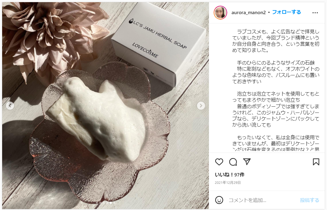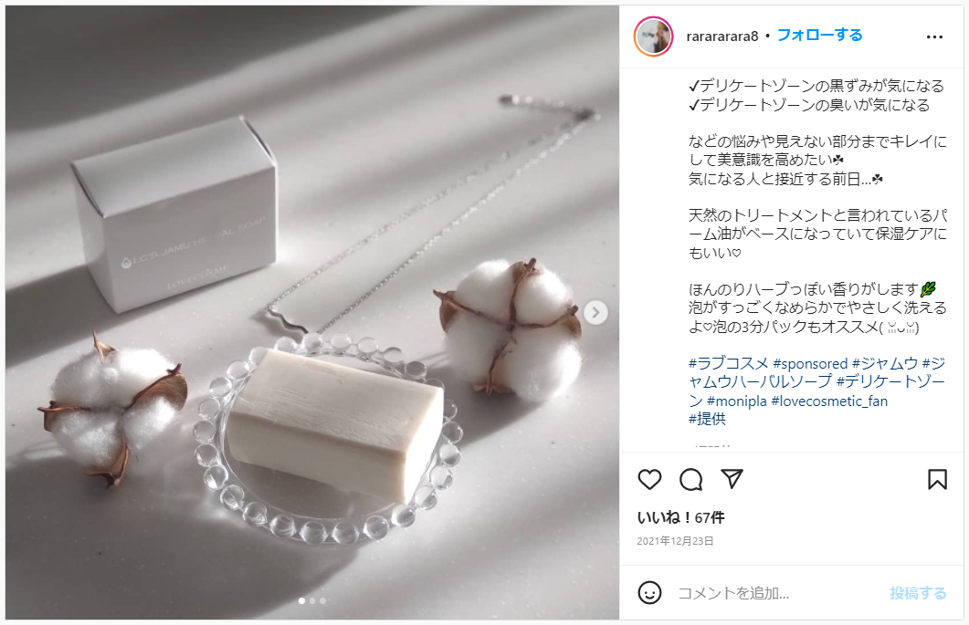 ※Instagramに投稿する際には #ラブコスメ #sponsored #ジャムウ #ジャムウハーバルソープ #デリケートゾーン #monipla #lovecosmetic_fan のハッシュタグをつけて投稿してください!