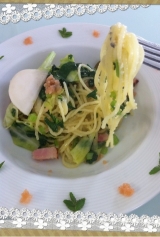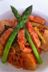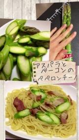 Love Farmの旬野菜で作ってみました第4弾!今回は、アスパラと小松菜で2つのパスタです♪まずはアスパラとベーコンでペペロンチーノ! 2013/04/09