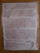 今回使ってみたのは、マダムアルバの exシリーズ、優れた保湿効果を発揮する潤い成分「リピジュア」をたっぷり配合した保湿ローション/クリーム/エッセンス/ 2011/11/05