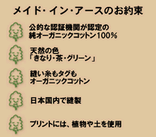 メイド・イン・アースは、オーガニックコットン100%製品と純天然せっけんのブランドです。ふわふわな綿の風合いをたっぷり残したオーガニックコットンのタオルやバス用品・衣類・寝具・布ナプキン等を通して、カラダにもココロにも居心地の良い日常生活を提案いたします。メイド・イン・アースのオーガニックコットン製品は、栽培だけでなく加工の段階でも化学処理をしていないので、天然の綿の風合いがたっぷり残っています。