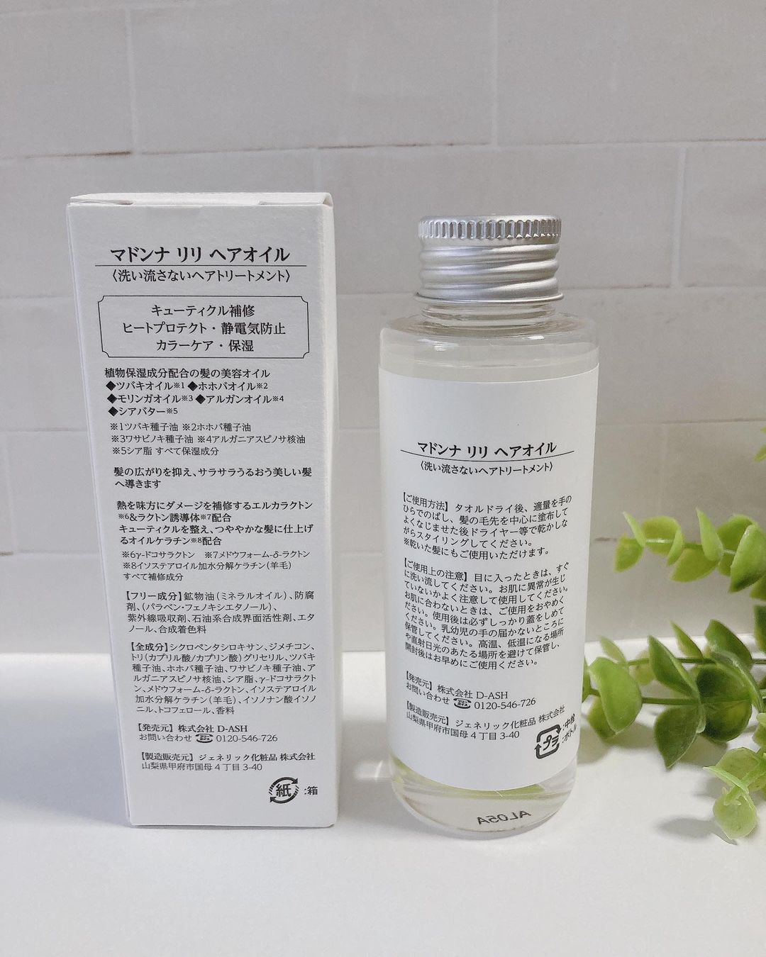 𓊱𓊱𓊱 🌿 MADONNA LILI マドンナ リリ ヘアオイル 100ml 🌿 LDK the Beautyの雑誌でA評価を獲得✨ 天然植物由来成分と毛髪補修成分を バランス良く配合したヘアオイルだよ❣︎ 毛髪補修成分になんと業界初の 「オイルケラチン」を配合し、傷んだ髪に タンパク質と脂肪酸を同時に補充し、 キューティクルを整えてうるおいと ツヤを与えてくれるらしい♡ しっかりとオイルを感じるテクスチャー。 髪の毛に付けると重たさは感じず スルスルとなじんでくれる。 軽い使用感でヌルつきなども感じない。 アウトバスとして使うと、 髪の毛が落ち着いて見える印象。 朝の乾いた髪の毛に使うと、ウェットと いうよりも、サラサラとする感じ。 アウトバストリートメントとしてはもちろん、 乾いた髪のスタイリングとしても どちらでも使えるマルチタイプです♪ 軽めのオイルが好きな方にオススメ✨ P.S 最近美容院行けてなくて、毛先バラバラで 写真映えしなくてすみません、、、💦 #PR #株式会社Dash #マドンナリリ #ヘアオイル #洗い流さないトリートメント #monipla #madonnalili_fan #アウトバストリートメント #ヘアケアアイテム #髪のパサつき #美容垢#美容垢さんとつながりたい#美容好きさんとつながりたい#スキンケア好きな人と繋がりたい#コスメ好きさんとつながりたい#キレイになりたい人と繋がりたい#メイク好きな人と繋がりたい