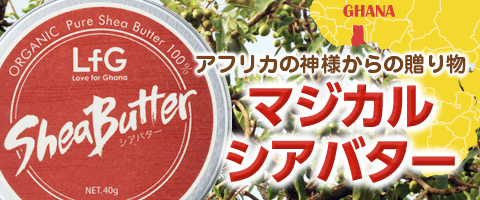 天然のシア脂100%。ガーナの現地法人「Love for Ghana」社のシアバターを空輸し、不純物を丁寧にとりのぞき、フレッシュな状態でパッケージしました。 |