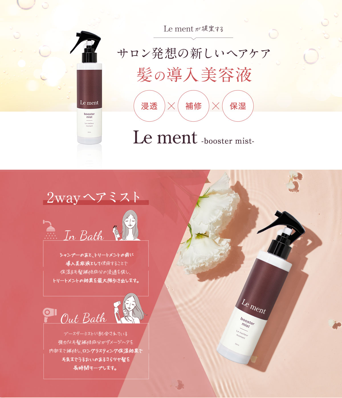 インバス&アウトバスのどちらでも使える、ノンシリコン2wayヘアミストです。シャンプーのあと、トリートメントの前に「髪の導入美容液」として使用することで保湿&補修成分の浸透を促し、トリートメントの効果を最大限引き出します。浸透性や吸着性に優れたペリセアが毛髪内部まで補修し、ロングラスティング保湿成分が毛先までうるおいのあるさらツヤ髪をキープします。寝ぐせ直しとして乾いた髪にも使えます。