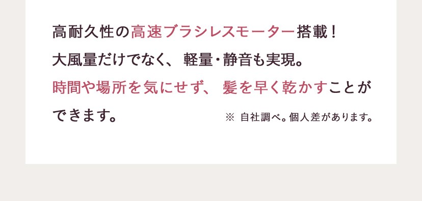 高速ブラシレスモーター搭載で大風量、軽量、静音を実現。時間や場所を気にせず髪を早く乾かします。