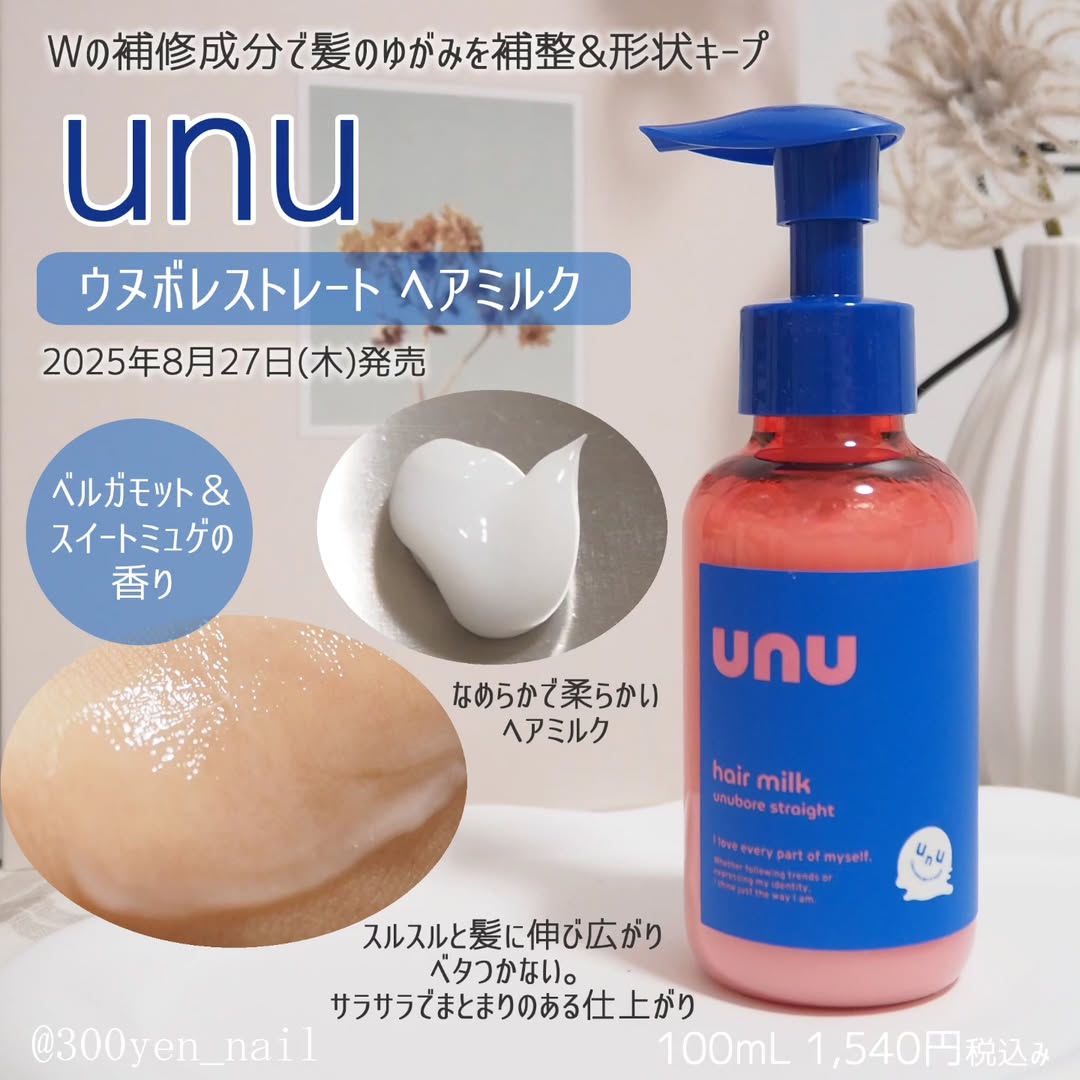 2025年8月27日(木)発売、 新ヘアケアブランド unu ウヌ「ウヌボレストレート ヘアミルク」を試しました。 Wの補修成分で髪のゆがみを補整&形状キープしてサラサラストレート髪に期待できるアイテム。 プッシュ式のボトルで取り出しやすく、出すとベルガモット&スイートミュゲの香りがとても好みでした。 なめらかで柔らかいテクスチャーのヘアミルクで、 スルスルと髪に伸び広がりやすかったです。 サラサラでまとまりのある仕上がりでベタつきにくかったです。 使用感も香りも好きなのでリピしたいアイテムに出会いました。 ―――――――――――――――― unu ウヌ「ウヌボレストレート ヘアミルク」 100mL 1,540円税込み unu(ウヌ)は“愛せる自分でいること"を応援するヘアケアブランドです。 「好き」「やってみたい」を素直に楽しむ世代に寄り添った ヘアケアアイテムを展開しています。 #PR #株式会社magicnumber #unu #ウヌ #新ブランド #新商品 #ヘアケア #うぬぼれ髪 #ストレート革命 #ストレート髪 #サラスト髪 #酸熱ケア #うねりケア #ウヌボレくん #ヘアミルク #monipla #magicnumber_fan