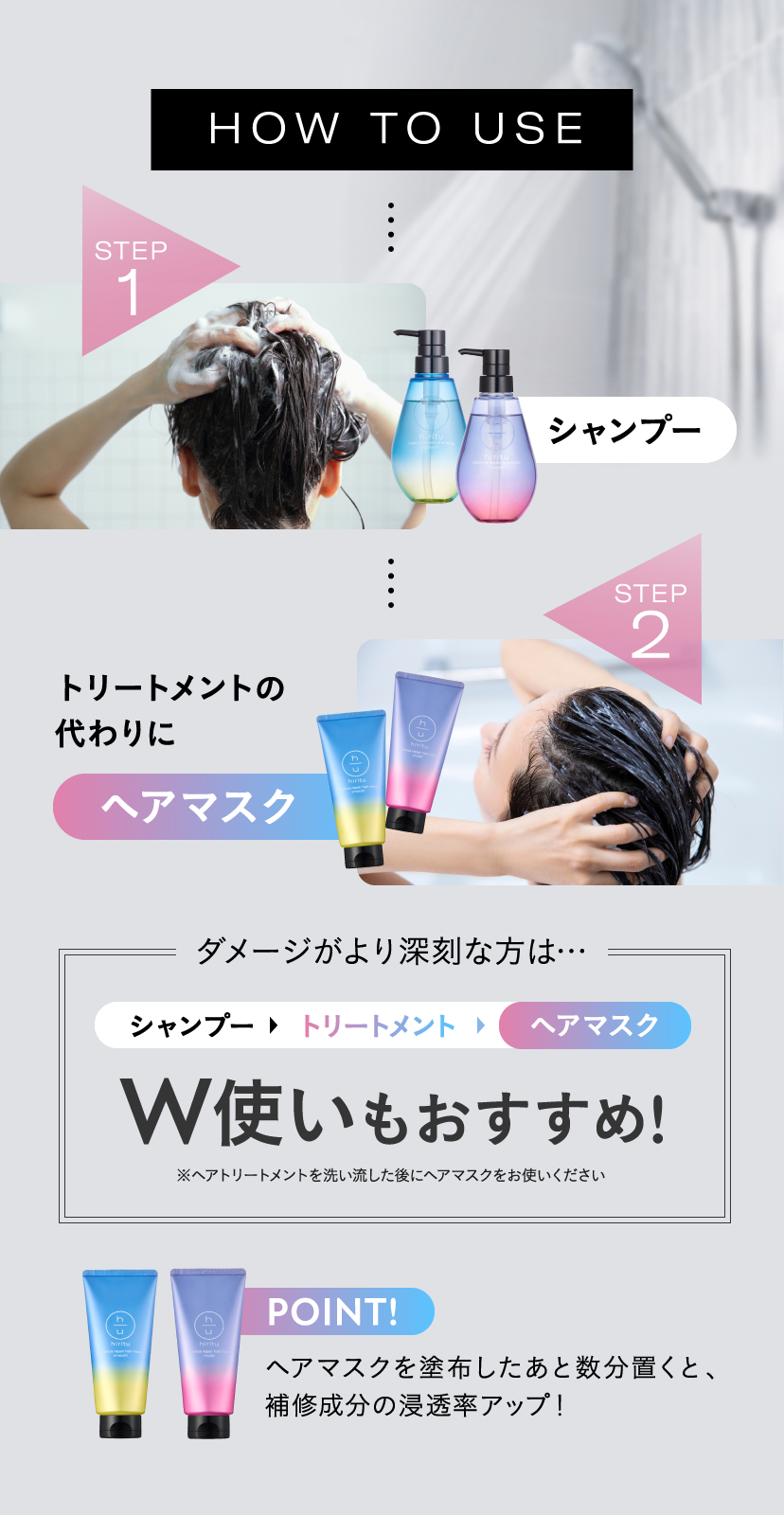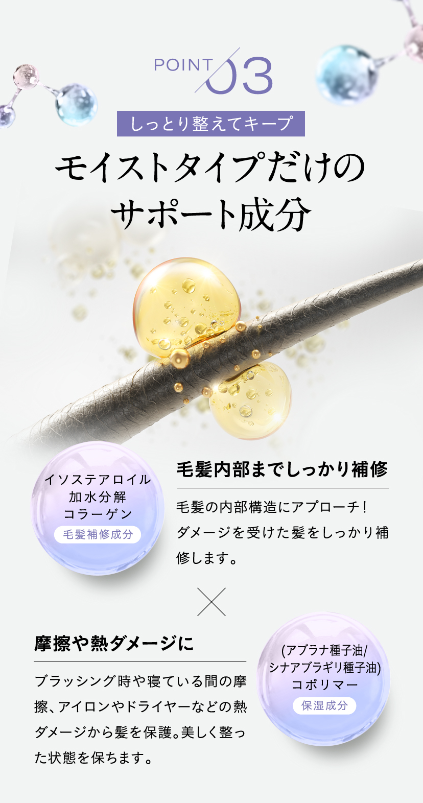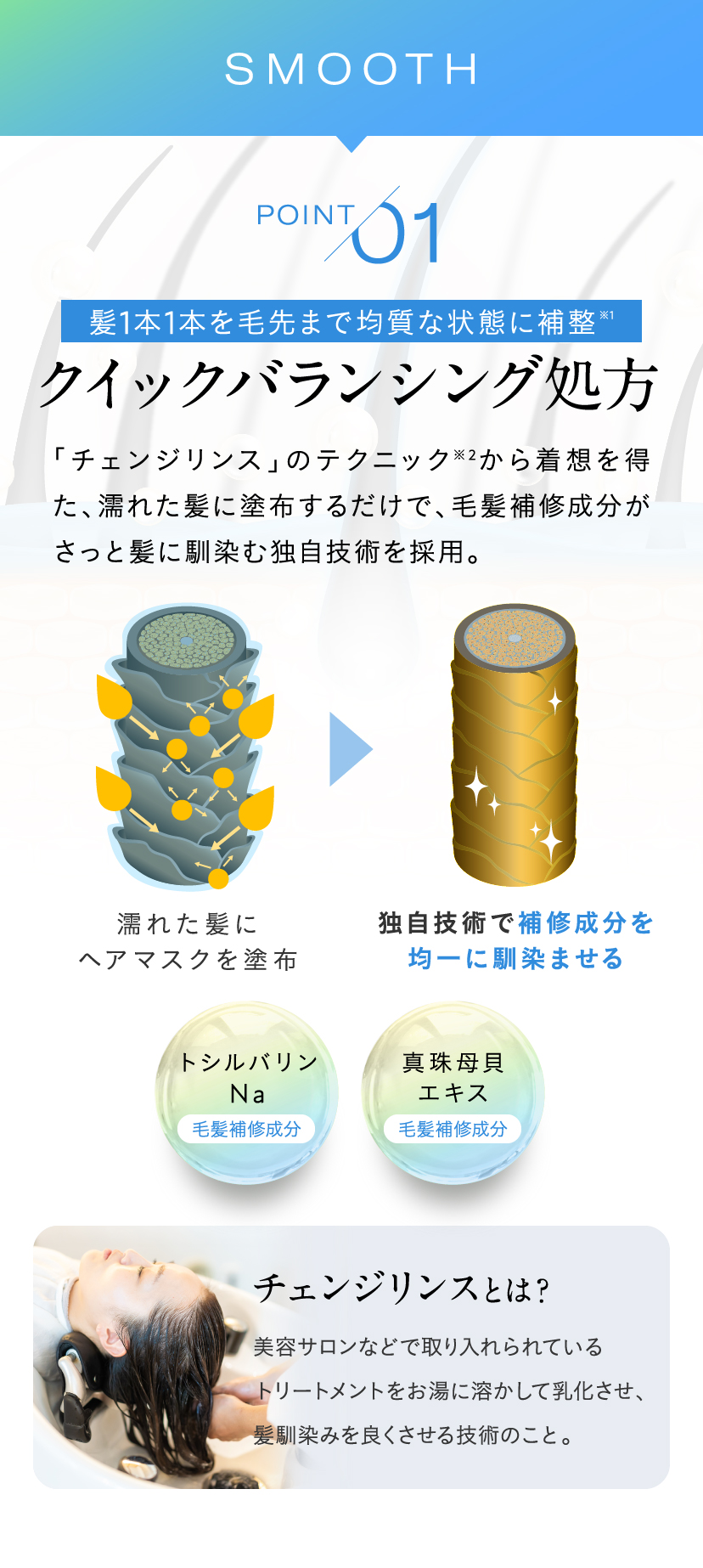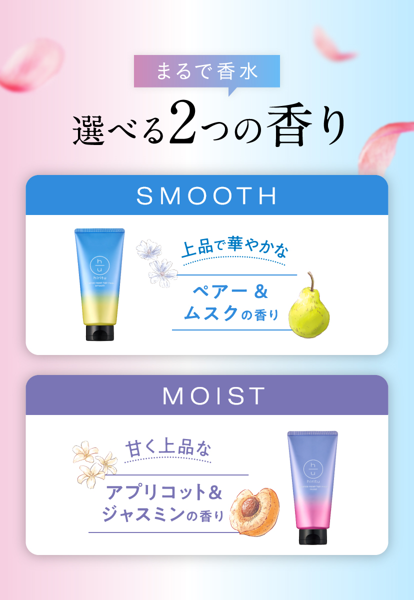 【SMOOTH】深刻なうねりにアプローチする髪質補整※1ヘアマスク。根元から毛先まで均質に整え、サラサラ髪へ導きます。毛髪補修成分を浸透させる「チェンジリンス」のテクニック※2から着想を得た、濡れた髪に塗布するだけで毛髪補修成分がさっと髪に馴染む独自技術を採用。体感8秒※3で髪1本1本を均質な状態に補整※4します。【MOIST】 深刻なパサつきにアプローチする髪質補整※1ヘアマスク。パサつく毛先まで潤質に整え、うるぷる髪へ導きます。植物由来のオイルが本来持つパワフルな保湿力を毛髪内部・外部に届きやすい形に独自技術で加工。馴染ませた直後から体感8秒※3でパサつく毛先までしっとり潤質な状態に補整※5します。
