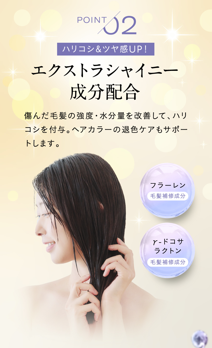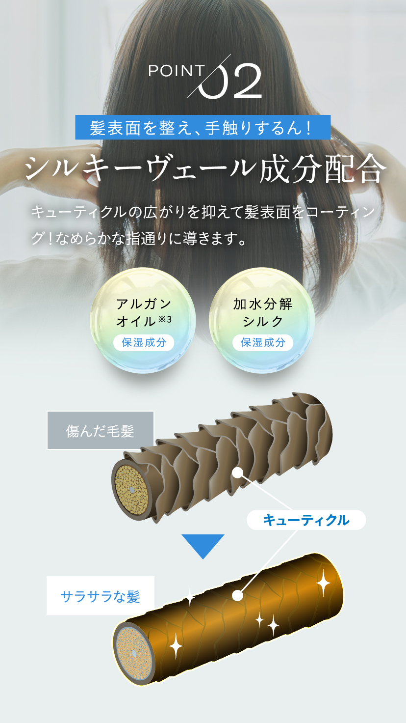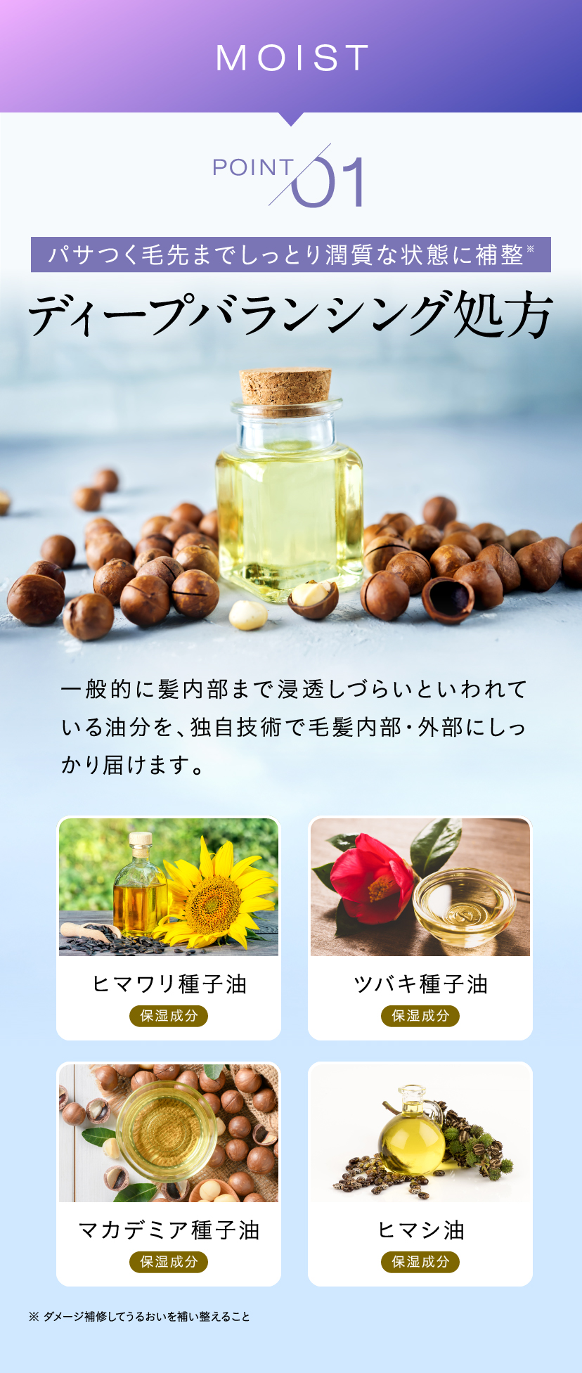 【SMOOTH】深刻なうねりにアプローチする髪質補整※1ヘアマスク。根元から毛先まで均質に整え、サラサラ髪へ導きます。毛髪補修成分を浸透させる「チェンジリンス」のテクニック※2から着想を得た、濡れた髪に塗布するだけで毛髪補修成分がさっと髪に馴染む独自技術を採用。体感8秒※3で髪1本1本を均質な状態に補整※4します。【MOIST】 深刻なパサつきにアプローチする髪質補整※1ヘアマスク。パサつく毛先まで潤質に整え、うるぷる髪へ導きます。植物由来のオイルが本来持つパワフルな保湿力を毛髪内部・外部に届きやすい形に独自技術で加工。馴染ませた直後から体感8秒※3でパサつく毛先までしっとり潤質な状態に補整※5します。