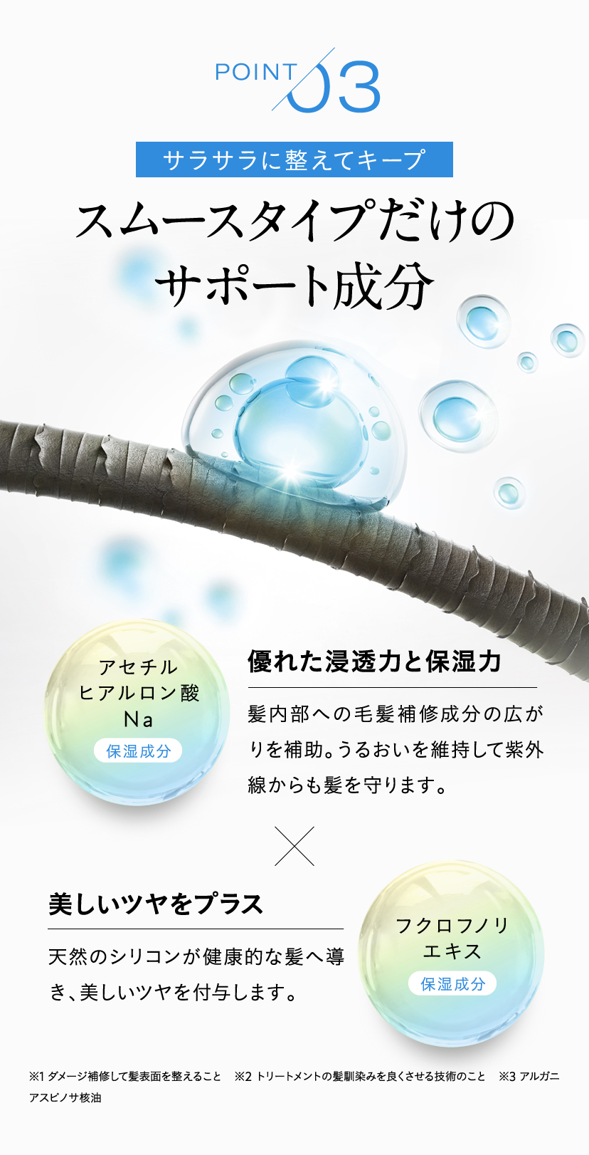 ※1 うるおいを補って髪の質感を整えること ※2 トリートメントの髪馴染みを良くさせる技術のこと ※3 髪に塗布する時間のこと ※4 ダメージ補修して髪表面を整えること ※5 ダメージ補修してうるおいを補い整えること