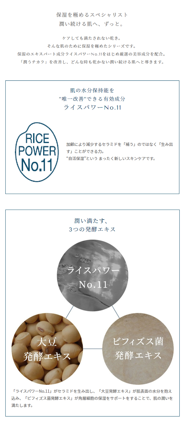 保湿のエキスパート成分ライスパワーNo.11をはじめ厳選の美容成分を配合。