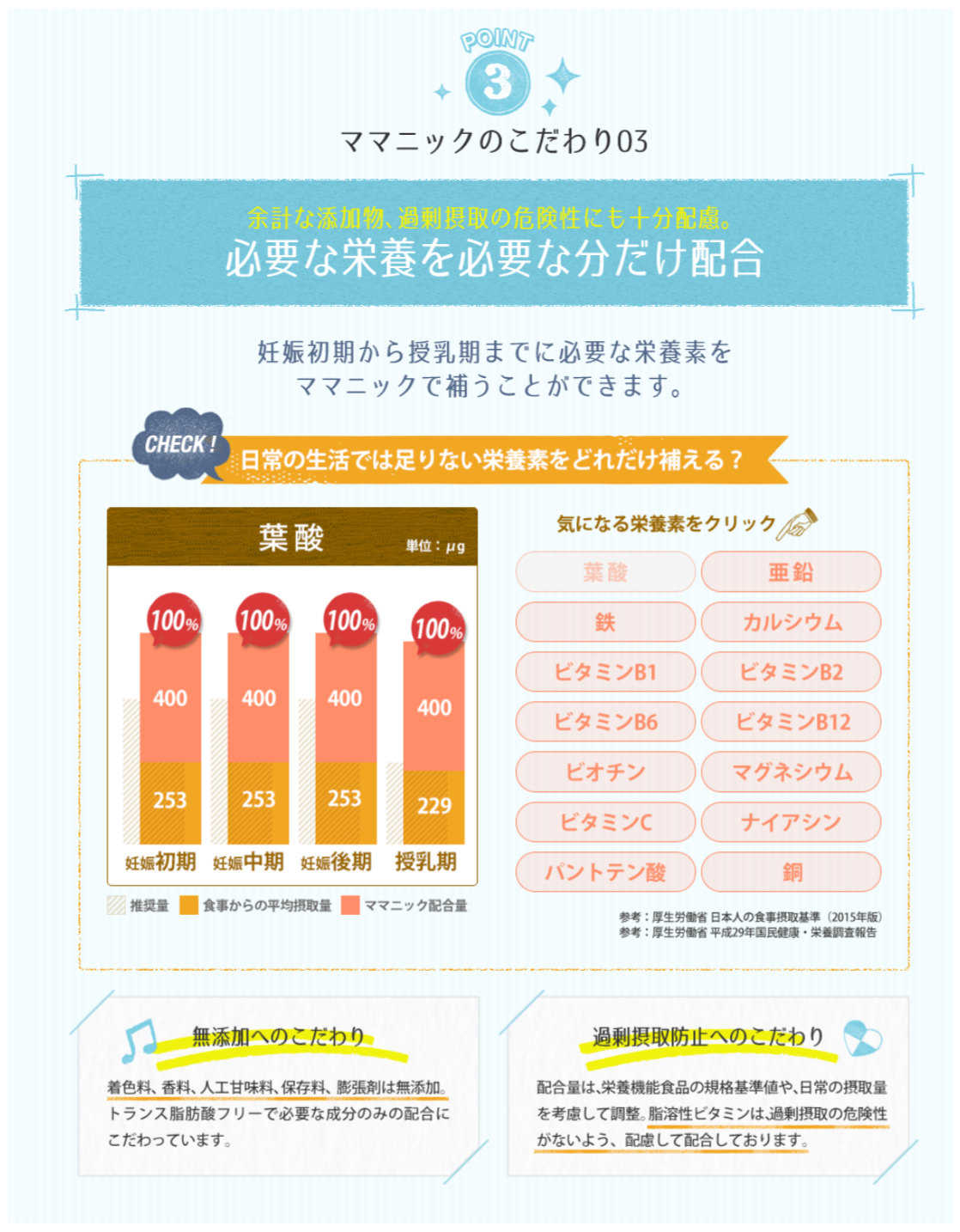 ママニック葉酸サプリは、管理栄養士指導のもと、妊活・妊娠中に必要な栄養をバランス良く摂ることができます。