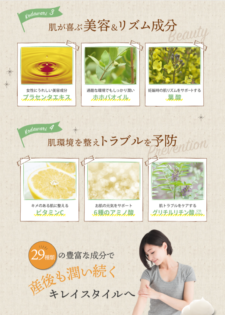 29種類の保湿成分と5種類のオーガニック成分を配合し、ベタつかずさらっとした使用感でお肌をやさしく潤す「無添加マタニティクリーム」。