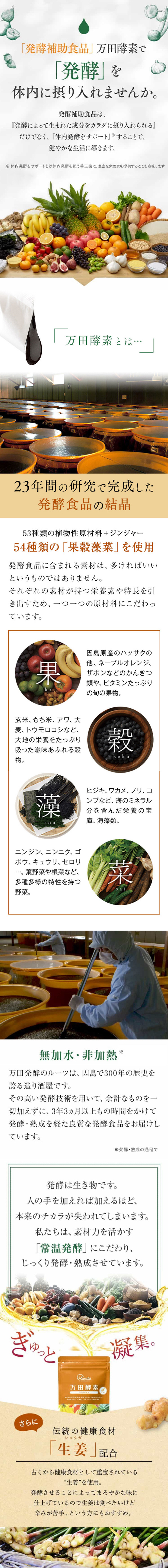 「なんとなく調子が出ない」「いつも疲れている」現代人を悩ます原因は、偏食や運動不足、代謝に関するものなど。「万田酵素」は、選びぬかれた53種類以上の「果物」「穀物」「海藻類」「野菜」をまるごと発酵させた植物発酵食品。