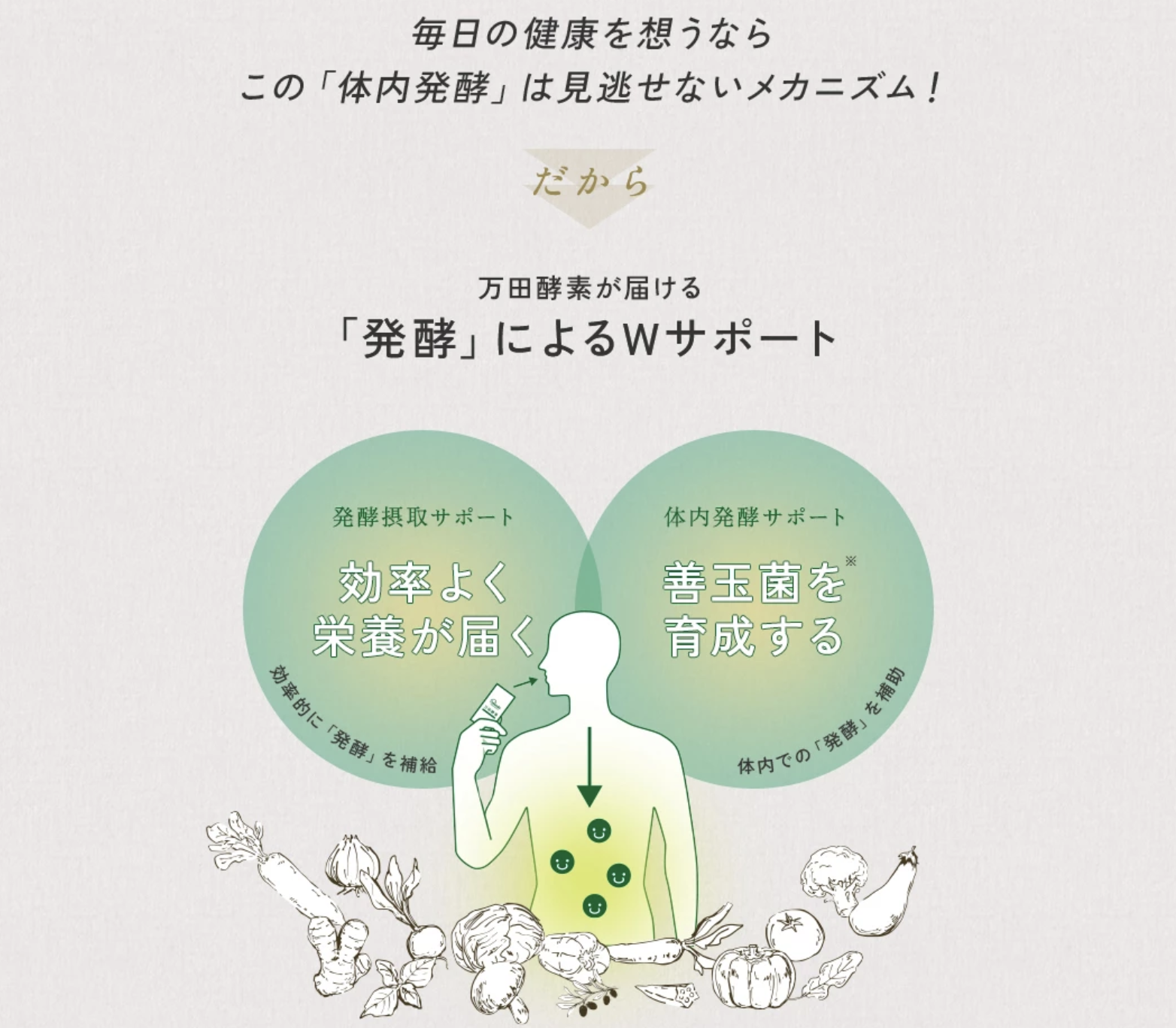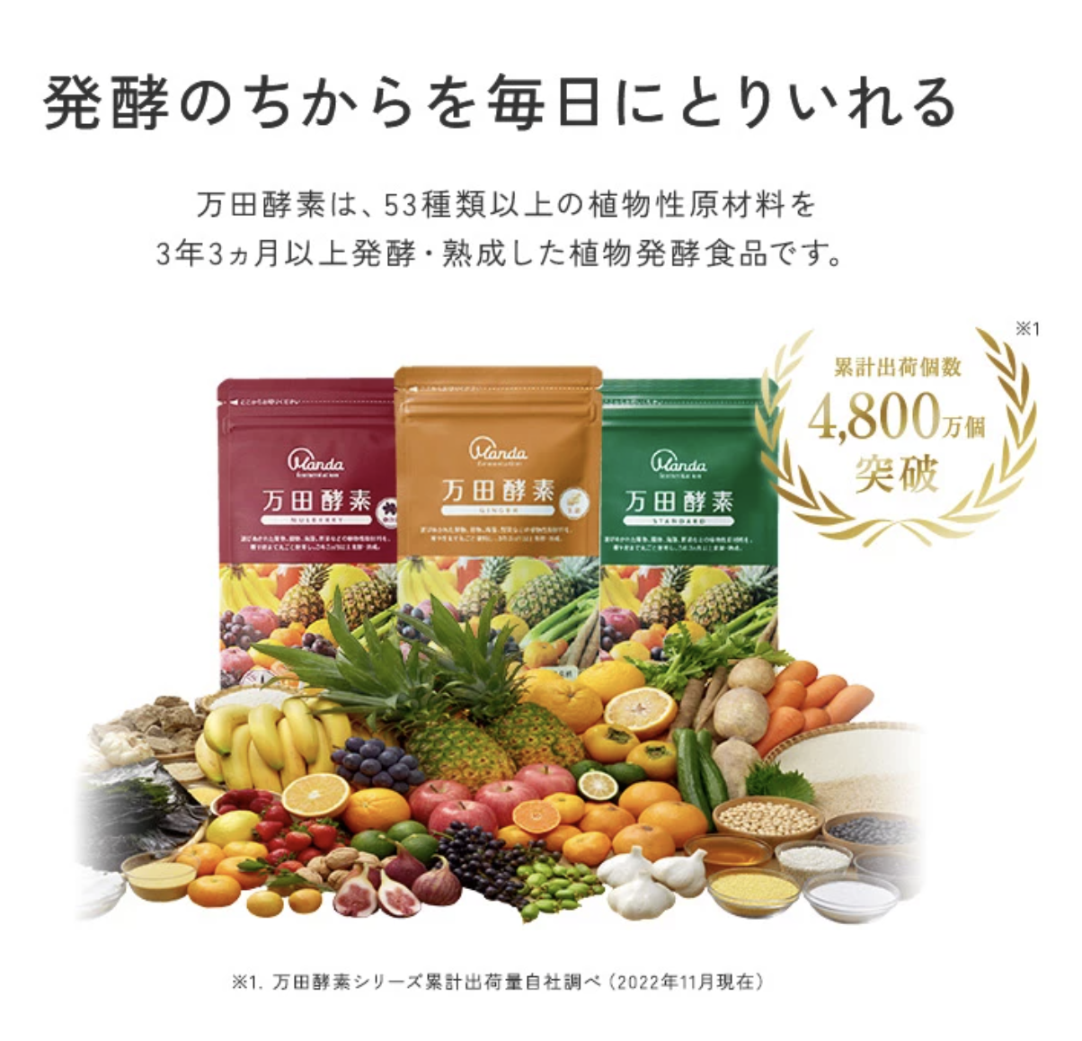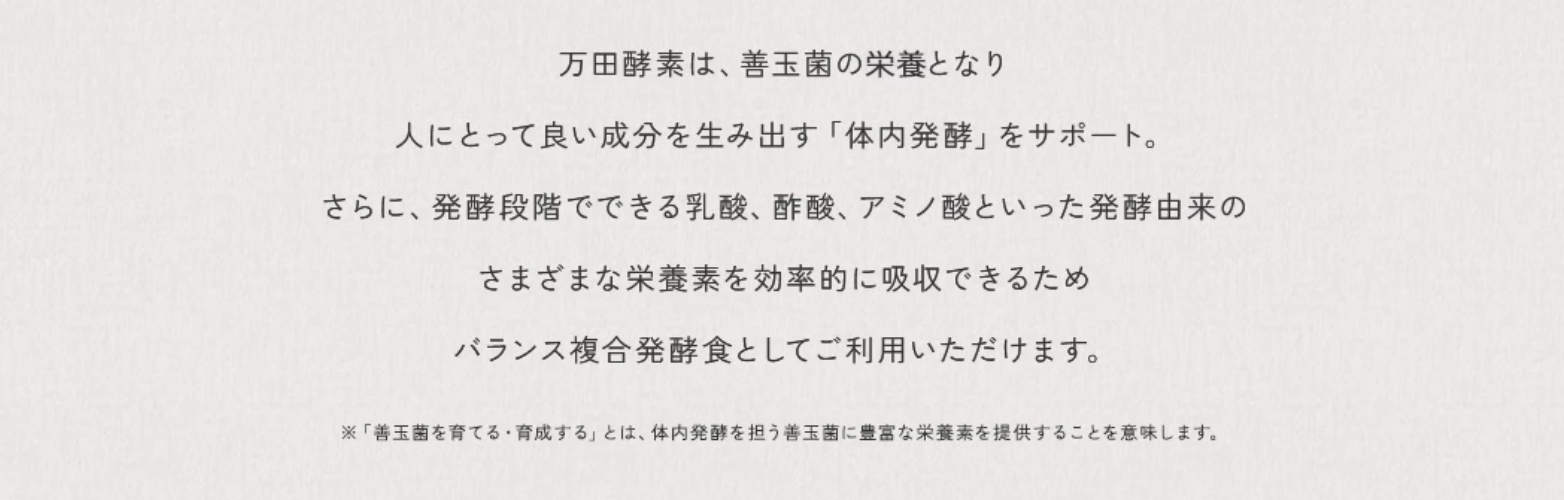 「なんとなく調子が出ない」「いつも疲れている」現代人を悩ます原因は、偏食や運動不足、代謝に関するものなど。「万田酵素」は、選びぬかれた53種類以上の「果物」「穀物」「海藻類」「野菜」をまるごと発酵させた植物発酵食品。