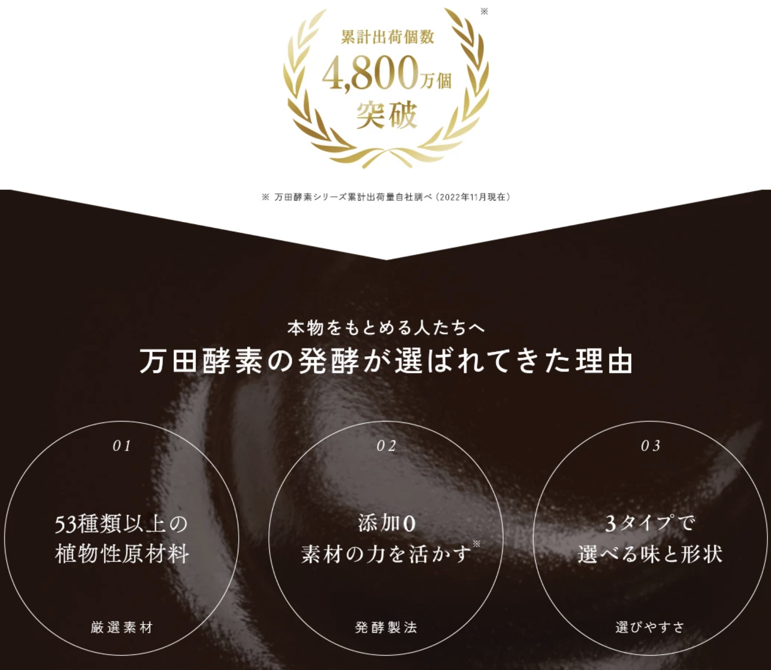 「自然の恵みを、人と自然のために役立てたい。」そんな想いで開発された万田酵素は、53種類以上の植物性原材料を長期発酵・熟成した植物発酵食品です。