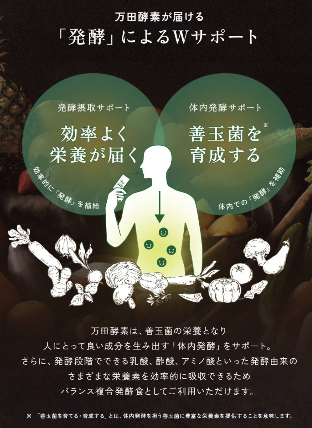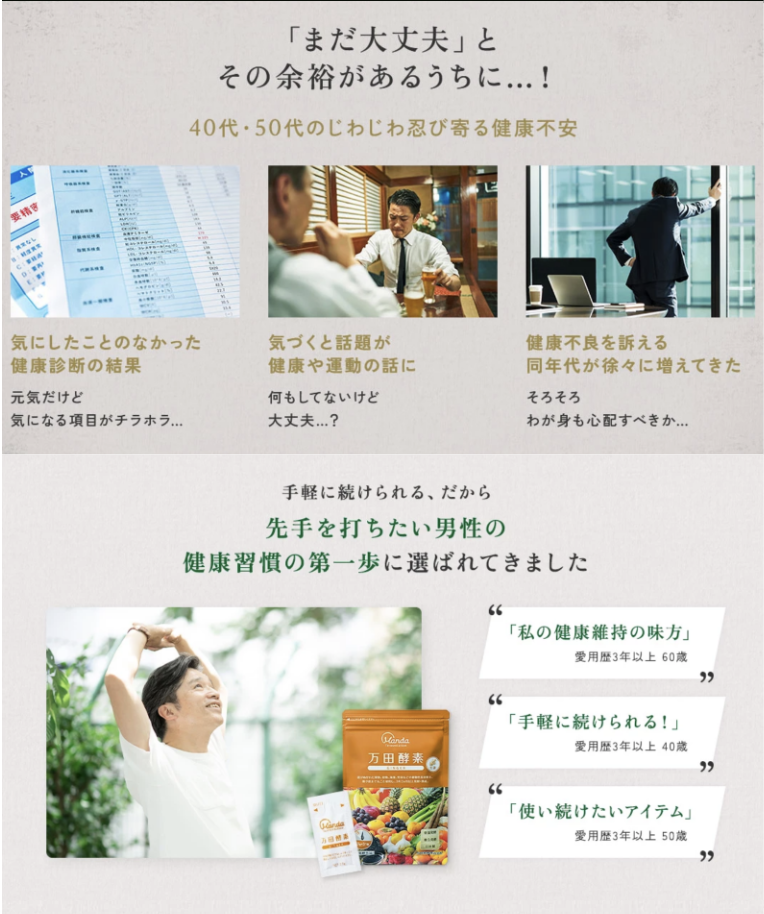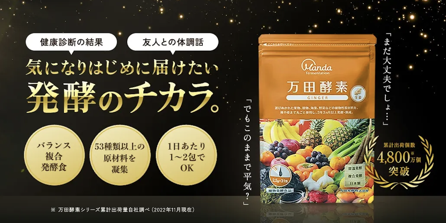 「なんとなく調子が出ない」「いつも疲れている」現代人を悩ます原因は、偏食や運動不足、代謝に関するものなど。「万田酵素」は、選びぬかれた53種類以上の「果物」「穀物」「海藻類」「野菜」をまるごと発酵させた植物発酵食品。