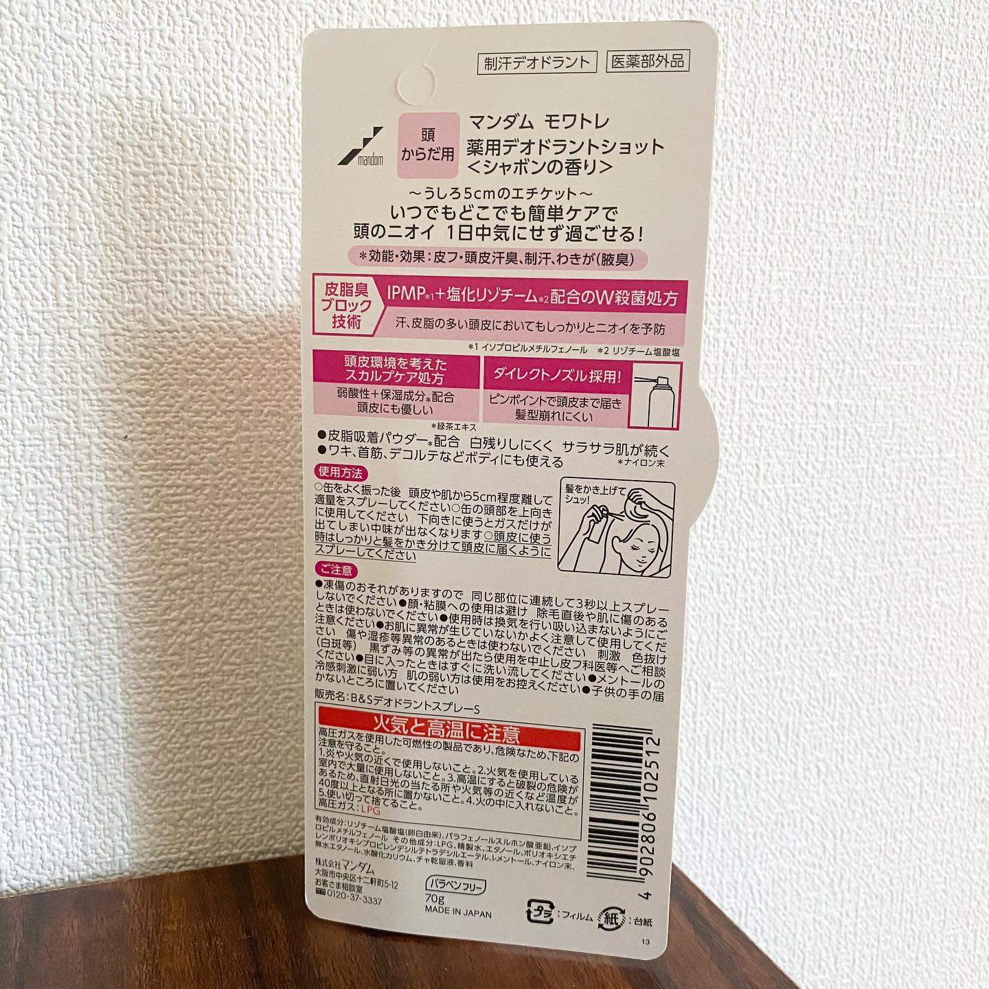 【頭皮の匂いケアしてますか?】 もうすぐ12月☃️ 寒いのが苦手な私はとにかく着ます👕 着膨れするんじゃないか… と言うほど着ます👕 そうすると、、、 汗をかきますね\(°∀° )/ そして、またジワジワ汗をかいたまま 外に出ると、とても冷えます(°∀° ) 寒いのが嫌だからと言って、「適度」を 知らない私です( ᵕ_ᵕ̩̩ ) そうなってくると、気になるのが 頭皮にかいた汗…の臭い( •̅_•̅ ) 自分ではなかなか気付きにくい場所の 臭いだからこそ、とても気になります💦 そんな私の心強いアイテム✨ マンダムの"デオドラントスプレー" シャボンの香りという事で、スプレーした ばかりの時は少し香りが強いけど 日中もずっと、ほんのーり香ってくれて しかも殺菌防臭もしてくれる♡◡̈⃝⋆* このスプレーは頭だけでなく体にも 使えるのでこれ一本あれば本当に心強い🤎 コンパクトなサイズなのでバックにいれて 持ち運びも出来ます✨ 冬でも匂いケア…してみてね◡̈♥︎ #モワトレ #薬用 #デオドラント #頭のニオイ #エチケット #ヘアフレグランス #バックハグ #あるある #monipla #mandom_fan