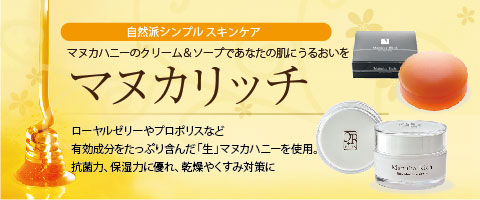 ローヤルゼリーやプロポリスなど有効成分をたっぷり含んだ「生」マヌカハニーを使用したオールインワン化粧品「マヌカリッチ」を提供しております。