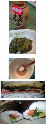 今年の 恵方巻き 今回の 恵方まきは、 ローソンのワンピースのおまけ付の恵方巻きです チョッパーの磁石を使って 西南西に向かい 丸かじりしました! 中身は、少し甘めでシンプル、 タマゴ、干瓢、椎茸、デンブ、アナゴ、高野豆腐、きゅうり の 7種類が入っていました… 2010/02/03