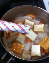 マルトモ『新鰹だしの素 スティックタイプ(8g×8袋)』をモニターさせて頂けることになりました 鰹節屋が作ったかつお風味のだしの素一層引立つかつおの香りと旨みが自慢です!と言う事で… 早速 新鰹だしの素 スティックタイプを使用して夕飯を作ってもらいました 蕪のお味噌汁と白菜と豚肉… 2012/01/19
