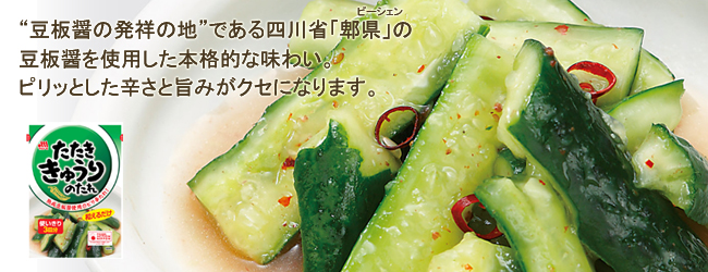 熟成豆板醤とごま油、ニンニクを配合した中華風のピリ辛たれで、食材と和えるだけで1品できあがります。